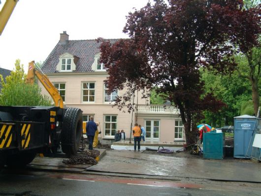 | De oorspronkelijke villa is uitgebreid met een grote erker. Op de foto is nog net zichtbaar hoe een enorme betonnen bak in een voor de villa gegraven gat wordt gehesen. Deze betonnen bak is bovenop afgewerkt als tuin en dient als kelder die toegankelijk is via  garage. Bijzonder spectaculair in de wetenschap dat de grond vrij instabiel is door de hoge waterstand van de aanpalende rivier. Het aanbrengen van bronbemaling was absoluut een “must” en gedurende de voorzichtig uitgevoerde graafwerkzaamheden werd continue in de gaten gehouden of  er ongewenste beweging zat in de grond en/of de woning. Uit het grondonderzoek dat hieraan vooraf ging was niet gebleken dat er verschuivingen op zouden treden maar toch …. .