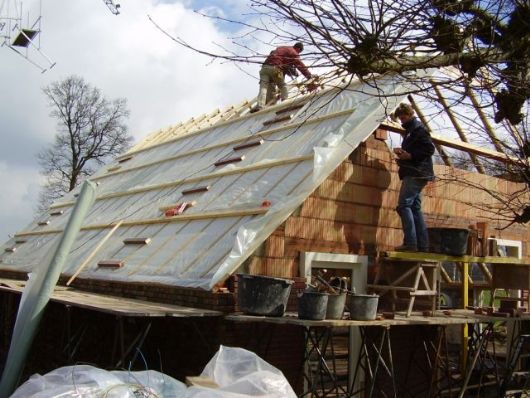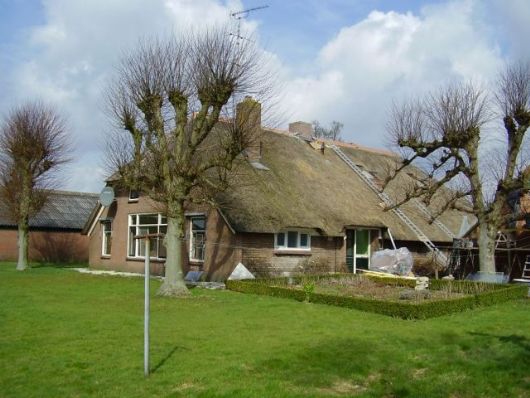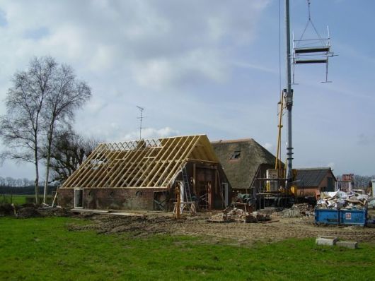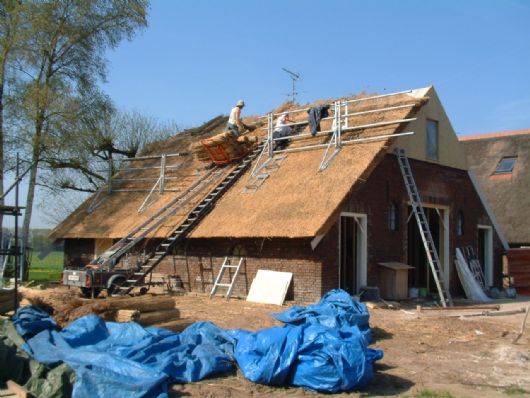 De achtergevel is geheel vernieuwd en de voorbereidingen om de rieten bedekking aan te brengen zijn in volle gang. De metselaar heeft zijn werkzaamheden tijdelijk moeten staken om een goed en veilig steiger te bouwen. |