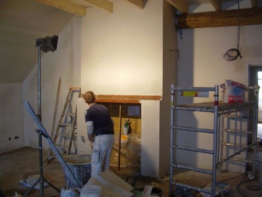 De afwerking van de openhaard op de voormalige deel is nabij. Ontwerp: BOUWRAADGEVER |